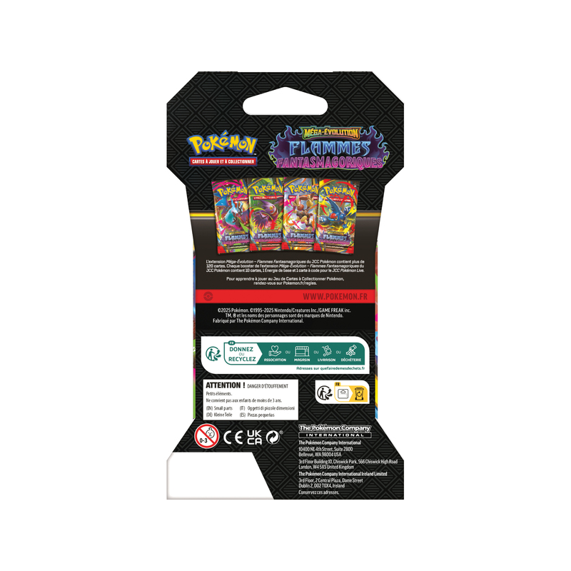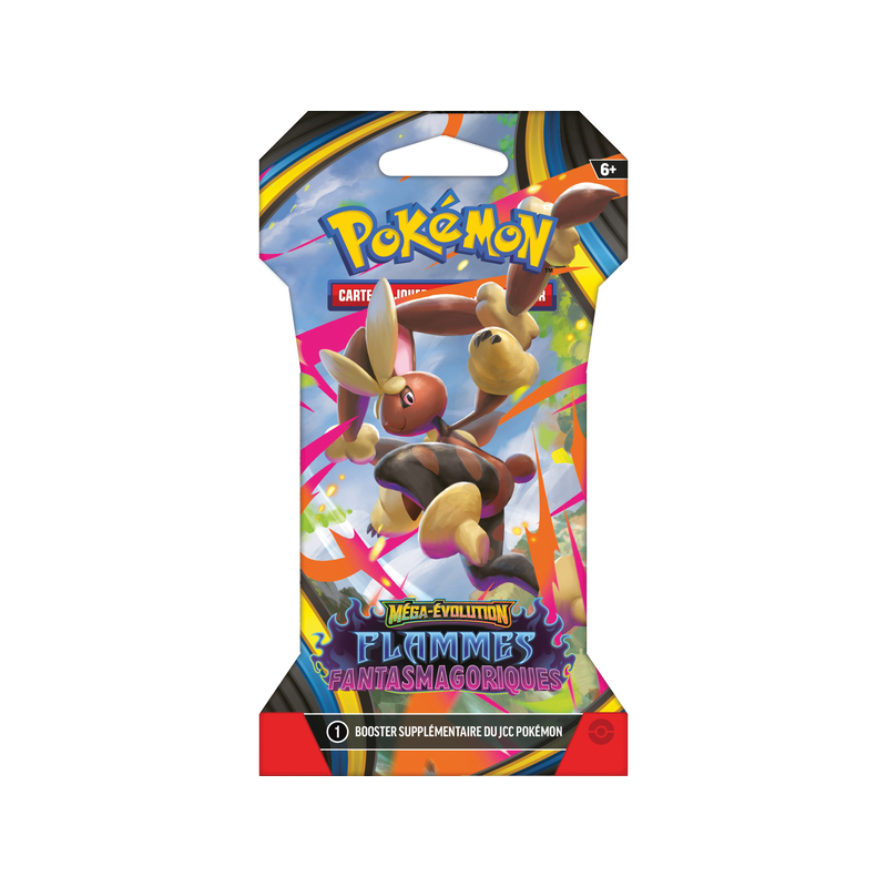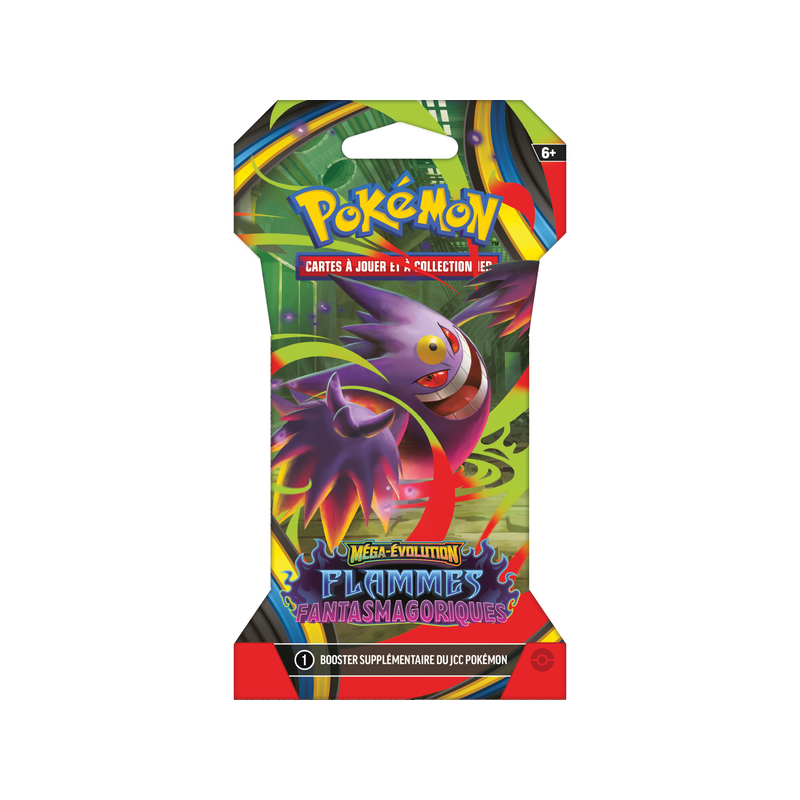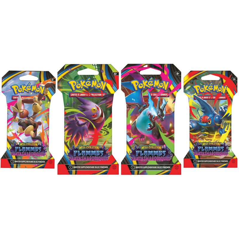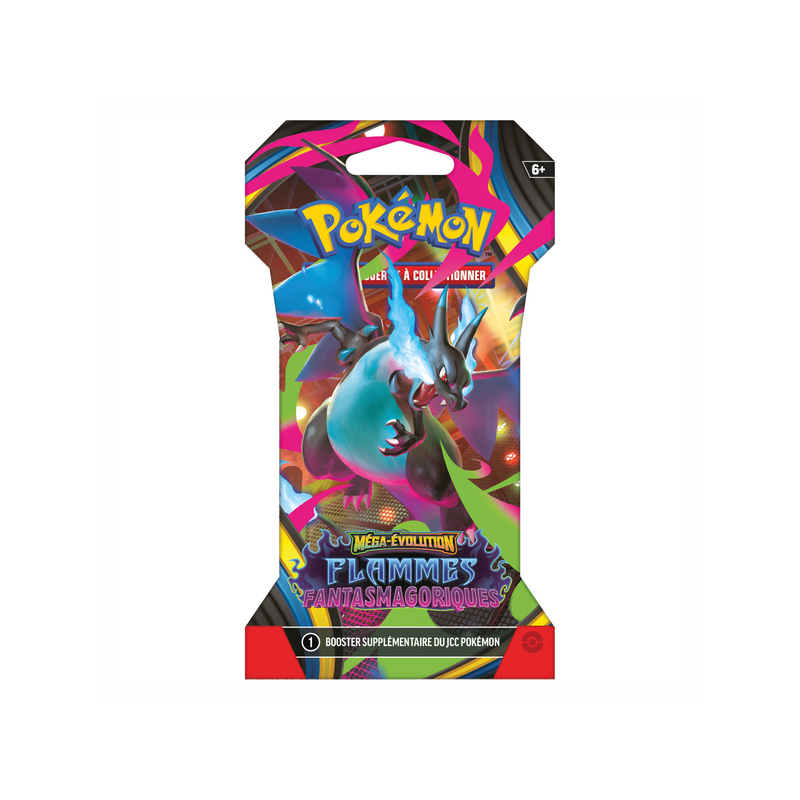 Chaque booster de 10 cartes issues de l’extension Flammes Fantasmagoriques où les Méga-Évolutions embrasent l’arène dans un déchaînement de puissance