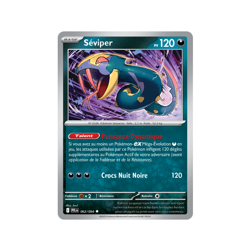 Carte Peu Commune Reverse du Pokémon Séviper Pv 120 numéro 62/094 de la nouvelle extension Méga-Évolution Flammes Fantasmagoriques