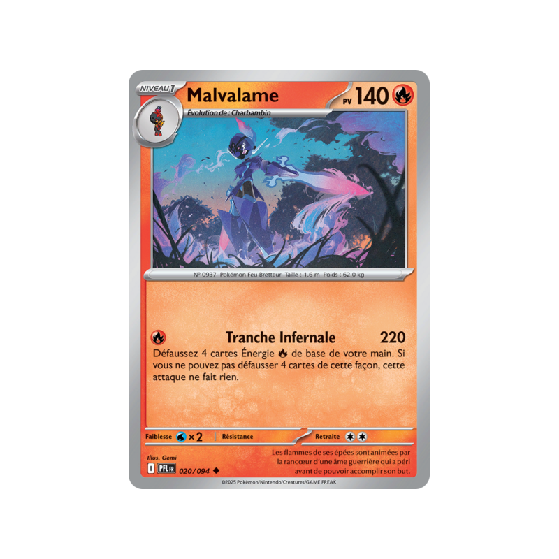Carte Peu Commune Reverse du Pokémon Malvalame Pv 140 numéro 020/094 de la nouvelle extension Méga-Évolution Flammes Fantasmagoriques