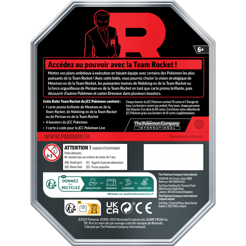 Mettez vos plans ambitieux à exécution en faisant équipe avec certains des Pokémon les plus puissants de la Team Rocket ! Avec cette boîte, vouspourrez choisir la vision stratégique de Mewtwo-ex de la Team Rocket, les puissantes toxines de Nidoking-ex de la Team Rocket ou la force orgueilleusede Persian-ex de la Team Rocket en tant que carte promo brillante, puis découvrir d’autres Pokémon et cartes Dresseur dans plusieurs boosters.