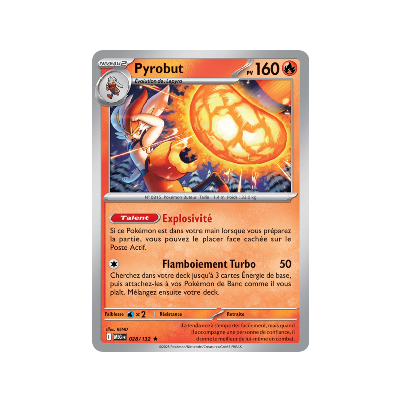 Carte Rare Holographique du Pokémon Pyrobut Pv 160 numéro 28/132 de la nouvelle extension Méga-Évolution