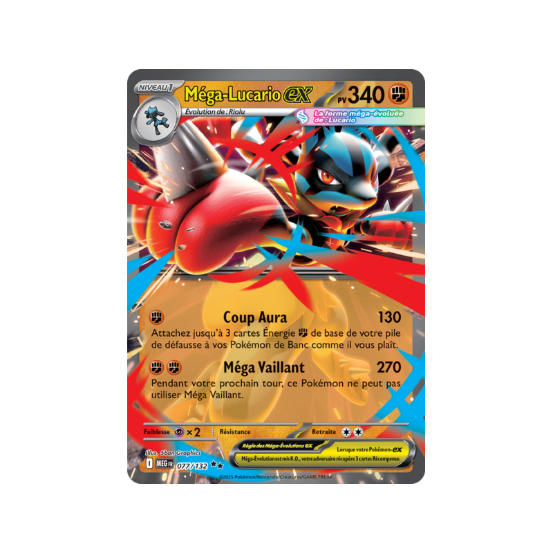Carte Double Rare du Pokémon Méga-Lucario-ex Pv 340 numéro 77/132 de la nouvelle extension Méga-Évolution