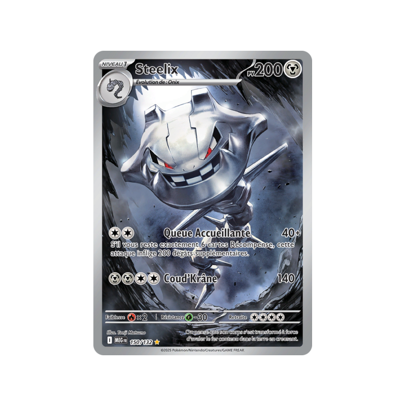Carte Secrète Illustration Rare du Pokémon Steelix Pv 200 numéro 150/132 de la nouvelle extension Méga-Évolution