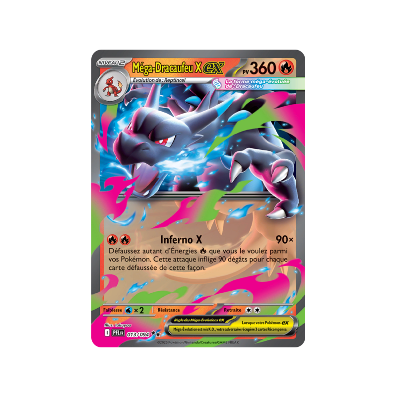 Carte Double Rare du Pokémon Méga-Dracaufeu X ex Pv 360 numéro 013/094 de la nouvelle extension Méga-Évolution Flammes Fantasmagoriques