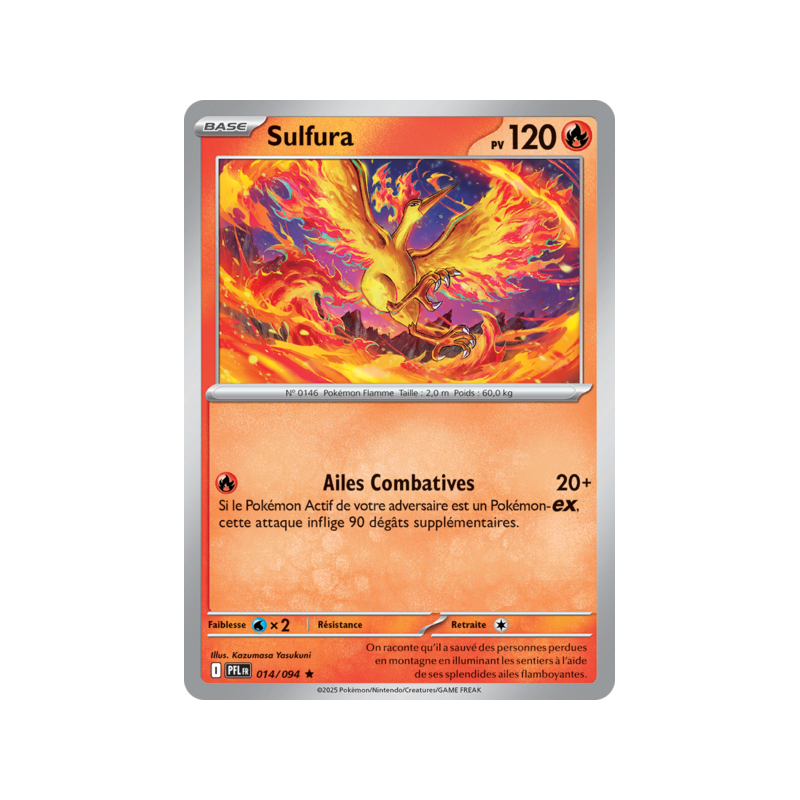 Carte Rare Holographique du Pokémon Sulfura Pv 120 numéro 014/094 de la nouvelle extension Méga-Évolution Flammes Fantasmagoriques