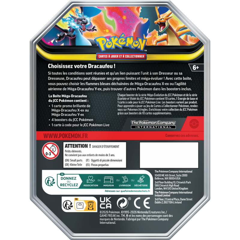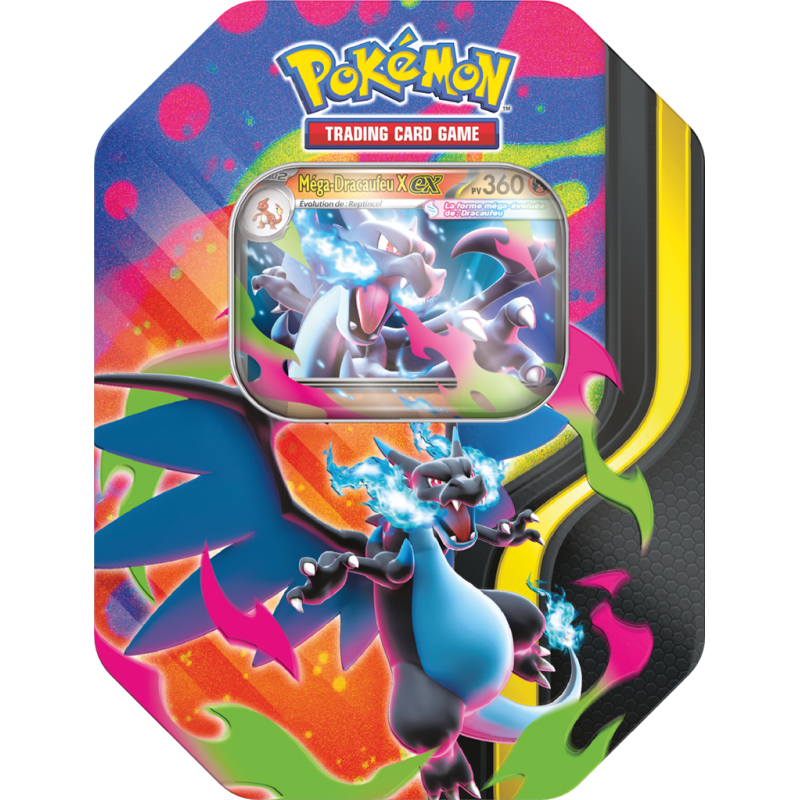 Si toutes les conditions sont réunies et qu’un lien puissant l’unit à son Dresseur ou sa Dresseuse, Dracaufeu peut dépasser ses propres limites et méga-évoluer ! Avec cette boîte, vous pouvez choisir les flammes bleues déchaînées de Méga-Dracaufeu X-ex ou l’agilité aérienne de Méga-Dracaufeu Y-ex, puis trouver d’autres Pokémon dans les boosters inclus.